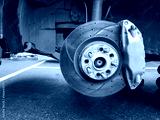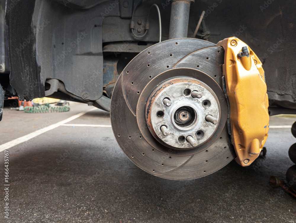 Car brake system with yellow caliper and brake disc, automotive maintenance context.