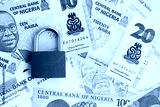 Nigerian naira currency money bills and padlock close up. The concept of sanctions and financial safety