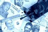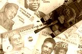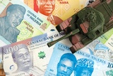 Nigerian naira currency money bills and toy tank close up. The concept of army funds and weapons sales