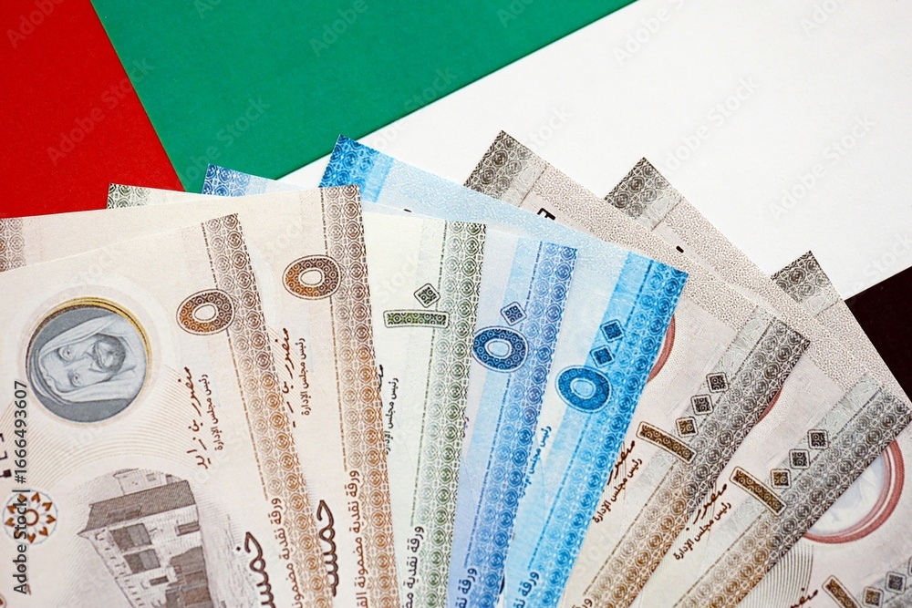 United Arab Emirates dirham currency money bills lies on flag close up. The concept of business and investment