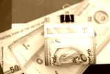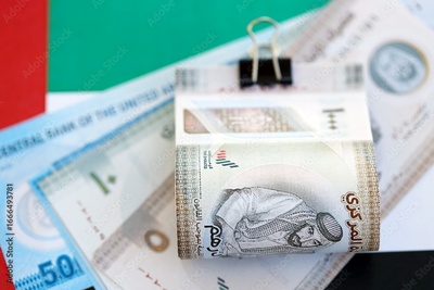 United Arab Emirates dirham currency money bills lies on flag close up. The concept of business and investment