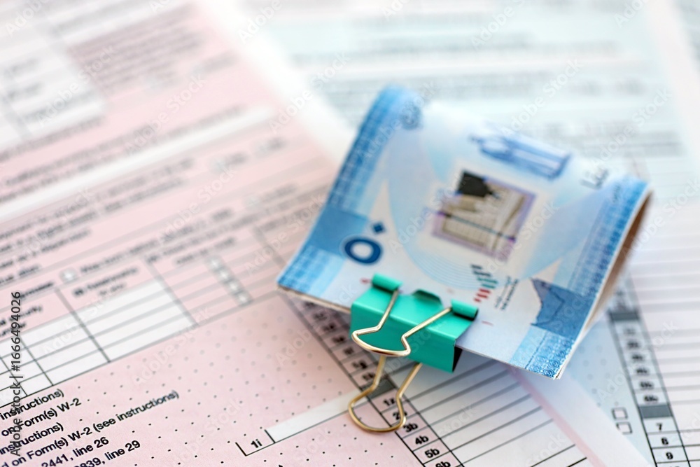 United Arab Emirates dirham money bills on tax form close up. Taxation and accounting concept