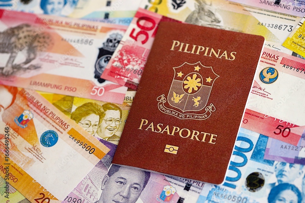 Philippines peso currency money bills and passport close up. The concept of travel and vacation
