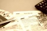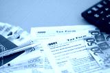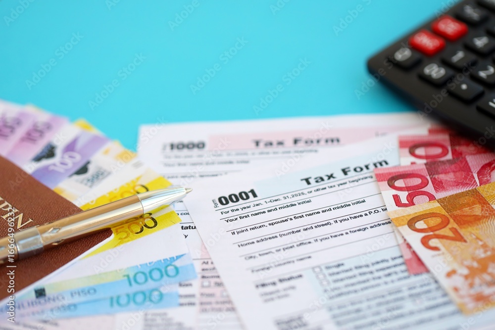 Philippines peso money bills and calculator with tax form close up on blue. Taxation and accounting concept