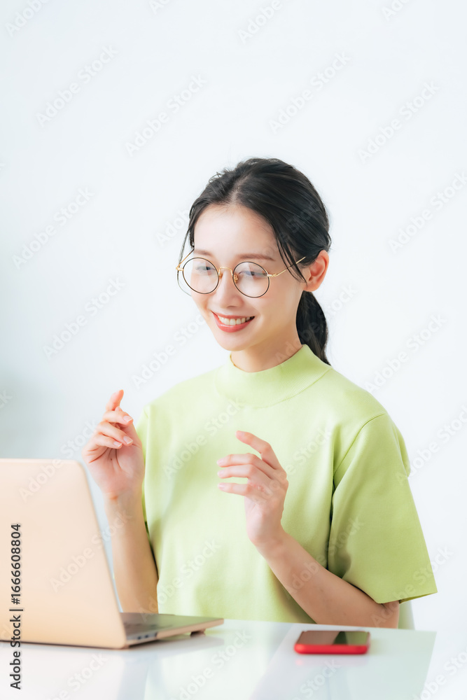 女性、ノートパソコン、英会話、ビデオ通話、ビデオ会議、仕事、PC、動画、会話、通話、オンライン、ビジネスウーマン、web、eラーニング、ビジネス、フリーランス、作業、インターネット、笑顔、職場、デスクワーク、バックオフィス、リモートワーク、在宅勤務、アウトソーシング、ジェスチャー、レッスン、カラフル、カジュアル、コピースペース、オフィス、テクノロジー、DX、デジタル、トランスフォーメーション、コミ