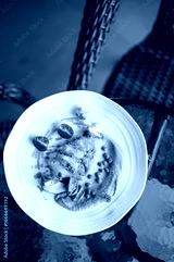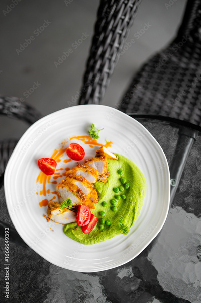 Gourmet chicken breast with brown sauce, pea puree, cherry tomatoes, and herbs, artistically plated on a white ceramic dish at a restaurant table