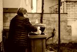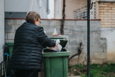 Elderly woman placing trash in a green garbage bin in a residential outdoor setting, representing responsibility, care for the environment, and daily routines.