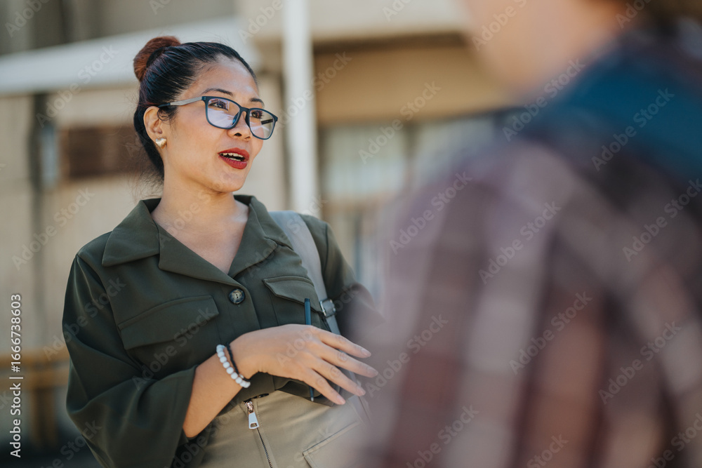 A woman wearing glasses and a green outfit is speaking outdoors in a courtyard. The background is blurred, emphasizing the outdoor environment and her expressive demeanor.