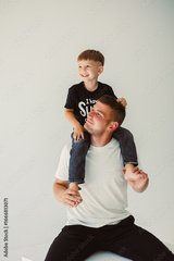 A joyful moment unfolds between a loving father and his energetic son, happily perched on his dads strong shoulders, showcasing their deep bond, filled with laughter and carefree happiness