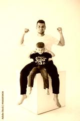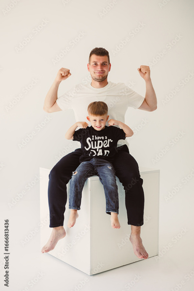 Strength and Bonding A Joyful and Playful Moment Shared Between a Father and His Son in a Bright, Minimalist Setting Filled with Light and Warmth, Capturing Their Unique Connection and Affection
