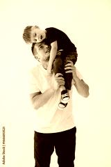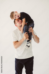 A heartwarming and joyful moment between a father and his child, captured in a cozy studio setting, illustrating the beautiful bond and connection that forms during their playful interaction