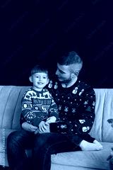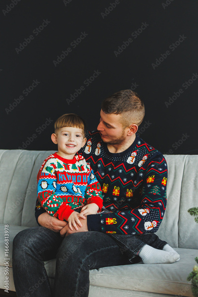 A Joyful Father and Son are seen together, both wearing festive and colorful sweaters, as they celebrate the wonderful holiday season filled with love, cheer, and happiness in their cozy home