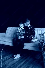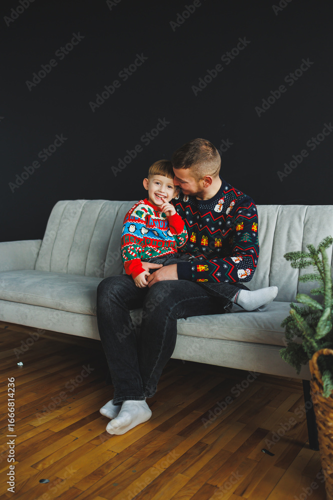 A truly heartwarming moment unfolds as a father and his son sit comfortably on a cozy sofa, both wearing matching festive sweaters that embody their affectionate bond and joyful togetherness
