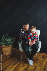 Experience the heartwarming holiday moment captured in a photograph, showcasing a father and his son, both clad in matching Christmas sweaters, evoking feelings of joy and festive celebration