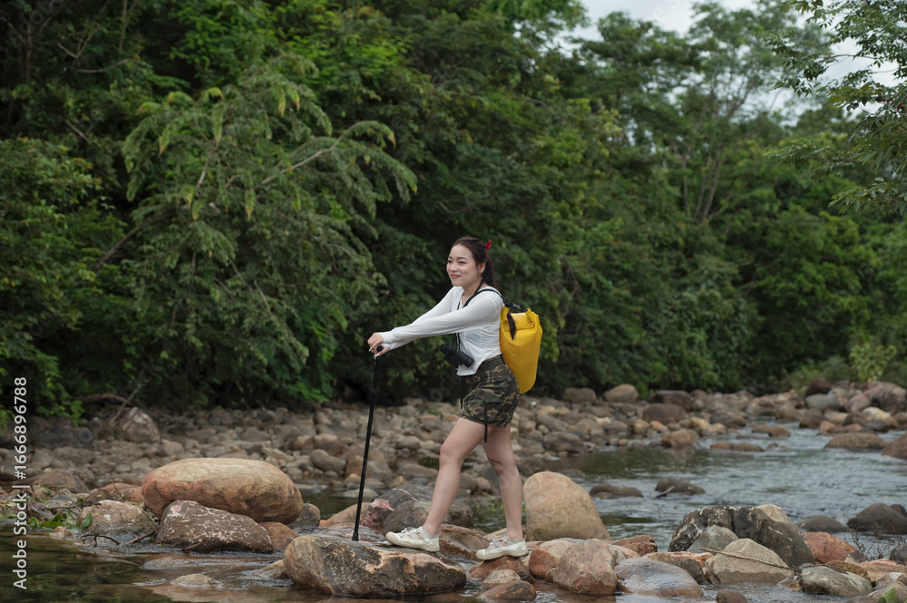 Young woman carrying a yellow backpack and camera is hiking through nature, carefully crossing a rocky stream in the forest. Outdoor adventure and eco-travel lifestyle concept.
