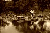 Young woman carrying a yellow backpack and camera is hiking through nature, carefully crossing a rocky stream in the forest. Outdoor adventure and eco-travel lifestyle concept.