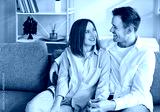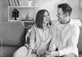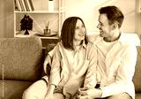 Portrait of loving married couple in love at home, posing smiling seated on couch in modern living room in happy moment, harmonic relationships, care and sincere feelings, good weekend day enjoy