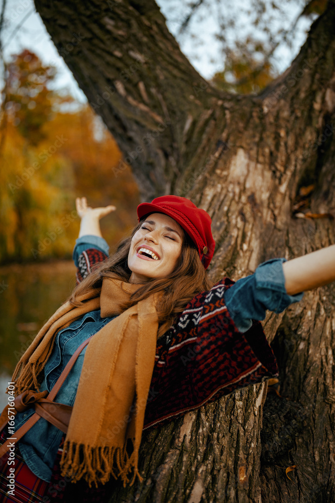 Hello autumn. smiling young woman in jeans shirt and red hat with scarf near tree in the city park.