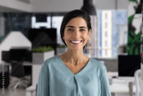 Head shot portrait of smiling confident Latina businesswoman, corporate coach standing in modern office, exuding positivity and professionalism, representing marketing department, or customer services