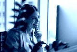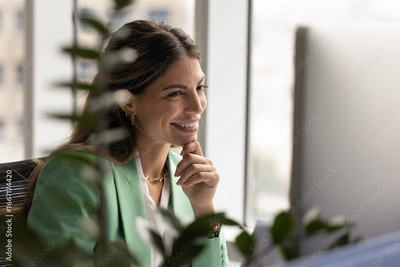 Close up professional Latina businesswoman sit at desk, smiling thoughtfully, looks at computer screen, engaged in virtual meeting, online communication or consultation. Remote work using modern tech