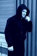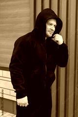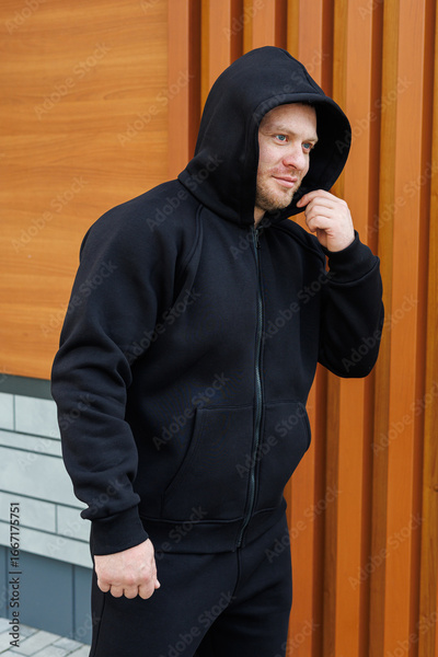 Street Fashion in Motion A Man Dressed in a Sleek Black Hoodie Exudes Urban Style and Personal Confidence as He Struts Through the City Streets, Capturing Attention with Every Step