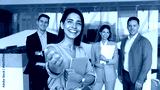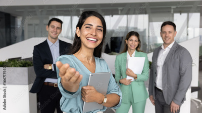 Portrait of businesswoman in foreground smiling confidently, reaching out with welcoming gesture while holding tablet. Leader or project manager inviting collaboration, onboarding client or colleague