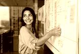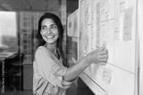 Smiling Latina professional woman placing sticky notes on large planning board, engaged in strategic planning, creative brainstorm session or workflow organization. Project management in modern office