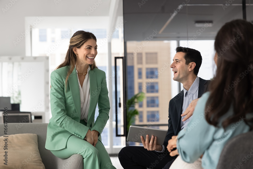 In stylish, modern office lounge area with city view, three young professionals engaged in relaxed, positive conversation, focus on smiling Hispanic woman laughing, enjoy interaction during briefing