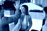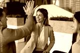 Enthusiastic teammates giving high five gesture, finalize briefing or seminar event successfully, expressing mutual respect, accomplish joint task, feel satisfied with teamwork outcome. Companionship