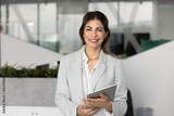 Portrait of happy Hispanic businesswoman dressed in elegant formal suit holding digital tablet, posing in modern workplace, looking at camera. Marketing department executive manager, profile picture