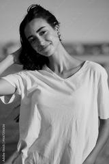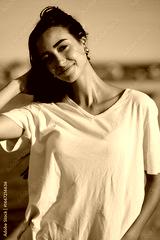 Young woman touching hair wearing yellow t shirt at sunset by the sea