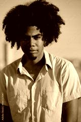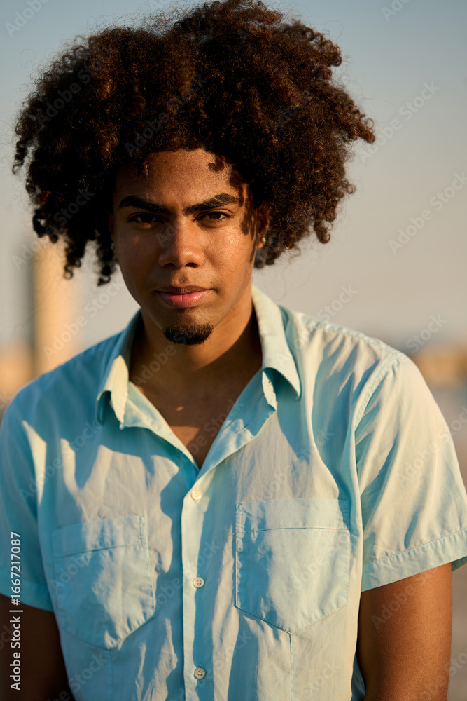 Young man with afro hair wearing light blue shirt is posing outdoors