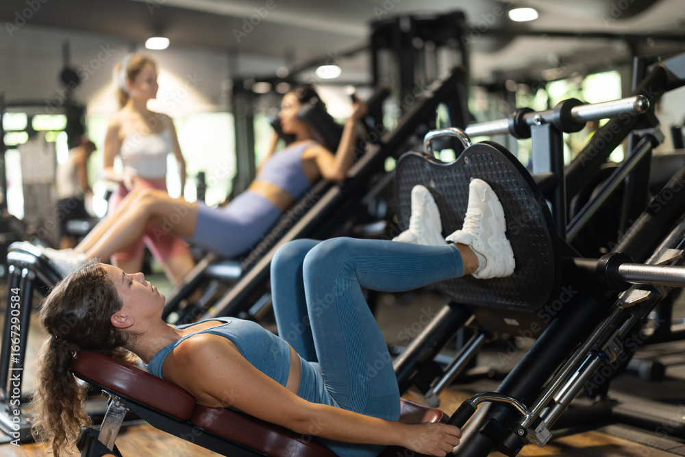 Athletic woman doing leg press in the machine. Young woman wants to build muscle, she goes to the gym and does strength training.