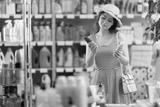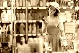 Young woman choosing spray - repellent from insects and mosquitoes near the shelves with household goods in the supermarket