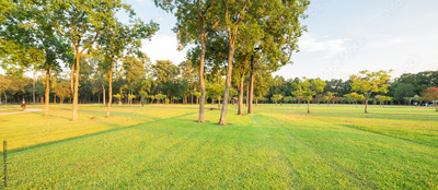 Beautiful green grass meadow and trees in big city park at Humble, Texas, US. Scene field, pine and oak tree, trail at sunset with warm light. Natural composition, healthy lifestyle concept. Panorama