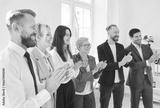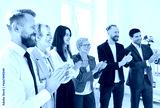 Group of young business people applauding standing in a row in office. Friendly smiling successful coworkers and company employees clapping a colleague on a meeting or business conference.