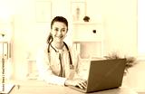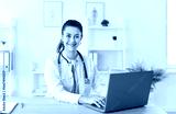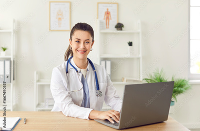 Portrait of confident young smiling female doctor in white medical uniform sitting at desk working on computer, smiling woman GP or physician at laptop, online medical journal in clinic, distant care