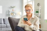 Portrait of smiling senior woman wearing casual clothes sitting on chair in the living room at home holding mobile phone in hands. Elderly female person using smartphone. Technology concept.