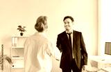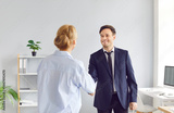 Two happy smiling business people man and woman standing in office, shaking hands, reaching agreement, making good deal, congratulating new partner or greeting new employee. Successful partnership.