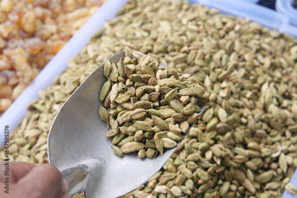 Afternoon market display of fresh cardamom pods