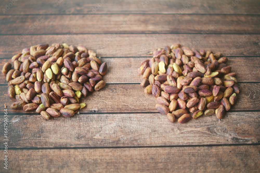 Piles of pistachios on wooden table for a healthy snack