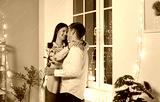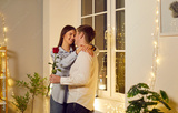 Young happy man holding red rose flower in hand hugging and congratulating girlfriend on holiday. Smiling couple man and woman in love standing at home looking at each other. Valentines day concept