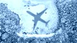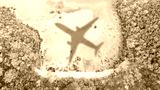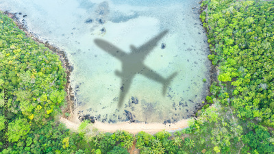 Aerial view of shadow passenger plane silhouette and sandy beach blue sea with waves at sea beach summer vacation sea travel concept