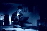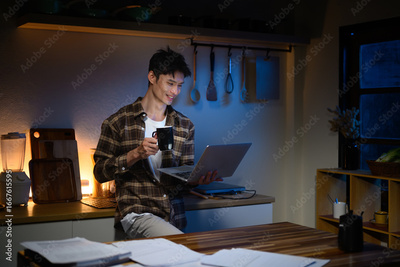 Relaxed man enjoying coffee while working on laptop late at night at home