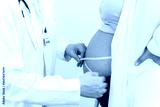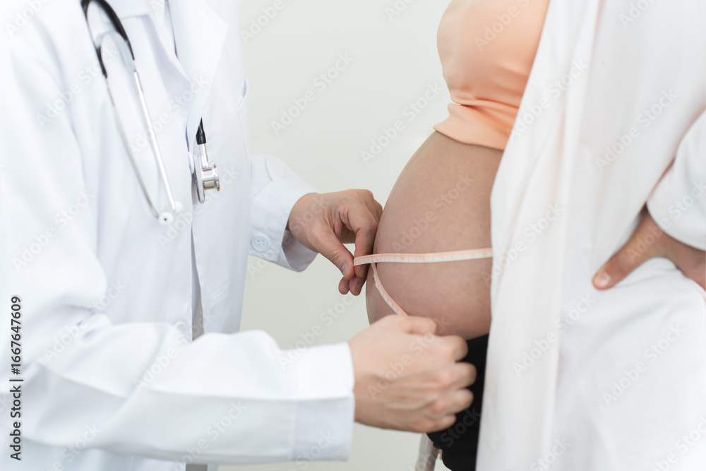 Close up of doctor hand using measuring tape to measure pregnant woman's belly in clinic. Mother in 25 weeks of pregnancy visit gynecologist for regular examining pregnancy health. Unrecognized people