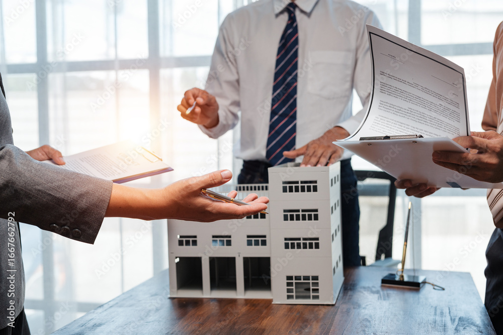 Real estate agents are examining documents and discussing a building project using a scale model on a desk