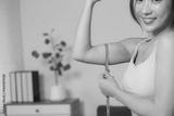 Asian woman flexing her biceps and measuring arm circumference with a tape measure, checking her workout results at home