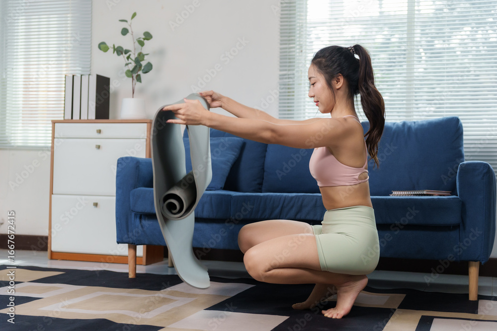 Asian sportswoman unrolling a yoga mat in her living room, preparing for a focused fitness workout and embracing a healthy lifestyle