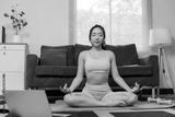 Asian girl doing online fitness training following a yoga class on her computer, relaxing and enjoying meditation in her living room