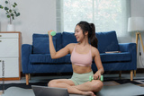 Asian sportswoman exercising with dumbbells while following online fitness lesson on laptop at home